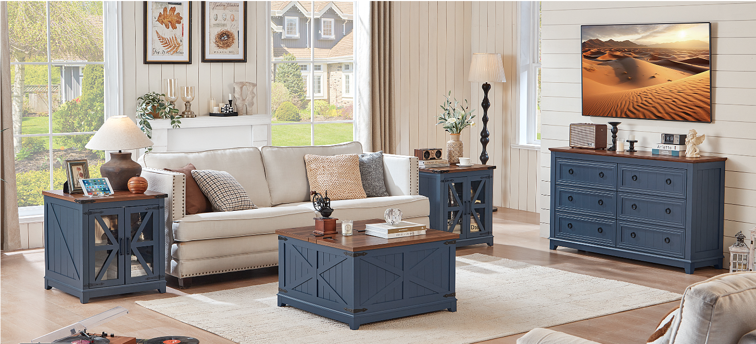 1-1 6 Cube Bookcase, Farmhouse Wood Low Storage Organizer Book Shelf, 47" Horizontal Navy Blue Console Bookshelf with Legs, Hallway Book Case for Entryway, Display Cabinet for Living Room, Office